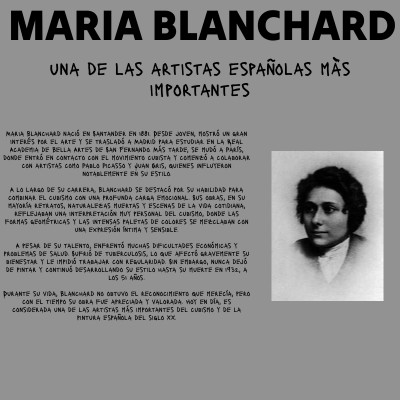 Maria Blanchard nació en Santander en 1881. Desde joven, mostró un gran interés por el arte y se trasladó a Madrid para estudiar en la Real Academia de Bella Artes de San Fernando. Más tarde, se mudó a París, donde entró en contacto con el movimiento cubista y comenzó a colaborar con artistas como Pablo Picasso y Juan Gris, quienes influyeron notablemente en su estilo. A lo largo de su carrera, Blanchard se destacó por su habilidad para combinar el cubismo con una profunda carga emocional. Sus obras, en su mayoría retratos, naturalezas muertas y escenas de la vida cotidiana, reflejaban una interpretación muy personal del cubismo, donde las formas geométricas y las intensas paletas de colores se mezclaban con una expresión íntima y sensible. A pesar de su talento, enfrentó muchas dificultades económicas y problemas de salud. Sufrió de tuberculosis, lo que afectó gravemente su bienestar y le impidió trabajar con regularidad. Sin embargo, nunca dejó de pintar y continuó desarrollando su estilo hasta su muerte en 1932, a los 51 años. Durante su vida, Blanchard no obtuvo el reconocimiento que merecía, pero con el tiempo su obra fue apreciada y valorada. Hoy en día, es considerada una de las artistas más importantes del cubismo y de la pintura española del siglo XX.