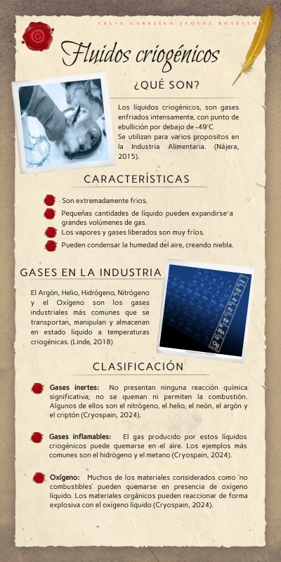 Air Liquide. (2022). Retrieved from ¿Cómo se utiliza el dióxido de carbono en la criogenia alimentaria?: https://es.airliquide.com/soluciones/criogenia-alimentaria/dioxido-de-carbono-en-la-criogenia-alimentaria-cual-es-su-uso#:~:text=%C2%BFC%C3%B3mo%20se%20utiliza%20el%20di%C3%B3xido,la%20producci%C3%B3n%20industrial%20de%20alimentos.&text=El%20di%C3%B3xido%Cryospain. (2024, Febrero). Retrieved from Líquidos criogénicos: qué son, cómo se obtienen y para qué se utilizan: https://cryospain.com/es/liquidos-criogenicos Gobierno de México. (2010, Diciembre 27). Retrieved from https://www.gob.mx/cms/uploads/attachment/file/138731/NOM-020-STPS-2011.pdf Gobierno de México. (2016, Octubre 25). Retrieved from Marco normativo para alimentos: https://www.gob.mx/cofepris/acciones-y-programas/marco-normativo-para-alimentos Institucional Colombia. (2023, Junio 8). Retrieved from Técnica de Nitrógeno líquido.: https://www.institucionalcolombia.com/tecnicas-de-cocina/nitrogeno-liquido-tecnica-de-cocina/#:~:text=Aprenda%20a%20usar%20%C3%A9sta%20t%C3%A9cnica,consumidores%20con%20la%20boca%20abierta. Linde. (2018). Manipulación de los Gases Criogénicos. Retrieved from https://www.linde-gas.es/shop/es/es-ig/manipulacion-de-gases-criogenicos#:~:text=Se%20dice%20que%20un%20l%C3%ADquido%20es%20%22criog%C3%A9nico%22,transportan%2C%20manipulan%20y%20almacenan%20en%20estado%20l%C3%ADquido Nájera, E. G. (2015, Mayo 18). LÍQUIDOS CRIOGÉNICOS. Retrieved from Universidad de la Rioja: https://www.unirioja.es/servicios/sprl/pdf/curso_criogenicos.pdf