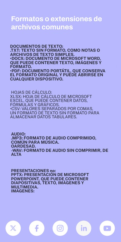 HOJAS DE CÁLCULO: XLSX: HOJA DE CÁLCULO DE MICROSOFT EXCEL, QUE PUEDE CONTENER DATOS, FÓRMULAS Y GRÁFICOS. •CSV: VALORES SEPARADOS POR COMAS, UN FORMATO DE TEXTO SIN FORMATO PARA ALMACENAR DATOS TABULARES.