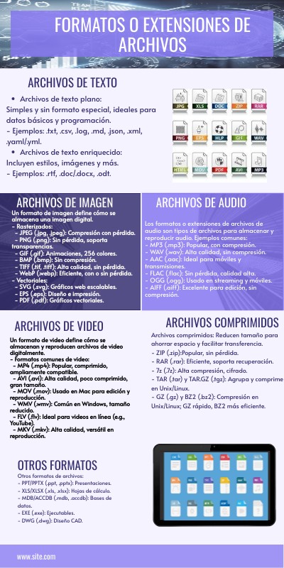 Otros formatos de archivos:- PPT/PPTX (.ppt, .pptx): Presentaciones. - XLS/XLSX (.xls, .xlsx): Hojas de cálculo. - MDB/ACCDB (.mdb, .accdb): Bases de datos. - EXE (.exe): Ejecutables. - DWG (.dwg): Diseño CAD.