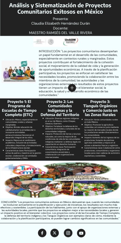 CONCLUSIÓN: "Los proyectos comunitarios exitosos en México demuestran que, cuando las comunidades se involucran activamente en la planificación y ejecución de iniciativas, los resultados son mucho más efectivos y sostenibles. La participación de los habitantes, junto con el apoyo de organizaciones externas y las autoridades locales, permite que los proyectos se adapten mejor a las necesidades locales y generen un impacto positivo en el bienestar colectivo. Los proyectos como el de las Escuelas de Tiempo Completo, la defensa del territorio indígena y los Tianguis Orgánicos son ejemplos claros de cómo, mediante la colaboración y la planificación participativa, se pueden lograr cambios significativos en las comunidades."
