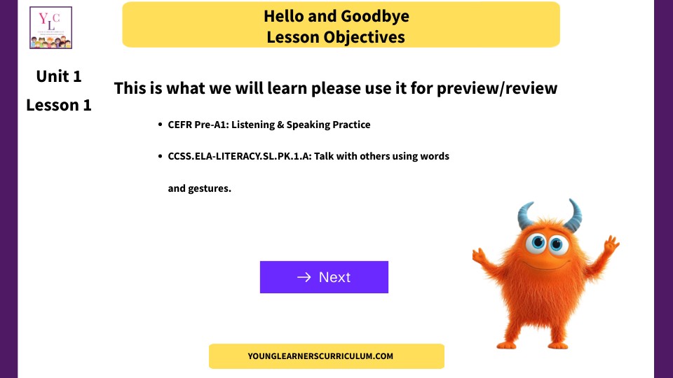 📌 家长指南:第8页 课程回顾 📖 目标: 通过点击、聆听和重复单词,帮助您的孩子复习今天学到的词汇和句子。 🔹 如何使用此活动 1️⃣ 点击单词或句子 每个按钮上都有一个单词或短语。 点击它,听发音。 2️⃣ 跟读单词或句子 点击后,鼓励孩子大声重复单词或句子。 让他们慢慢地、清晰地说出来。 3️⃣ 通过提问加深记忆 "见到别人时,我们该说什么?"(答案:Hello!) "离开时,我们该说什么?"(答案:Goodbye!) "你能介绍一下自己吗?"(答案:Hello, my name is ___!) 4️⃣ 鼓励完整句子表达 帮助孩子用完整句子表达: ✅ "Hello, my name is Sam." (你好,我叫 Sam。) ✅ "Nice to meet you!" (很高兴认识你!) 5️⃣ 让学习变得有趣!🎉 把这个练习变成小游戏: 让孩子不点击的情况下,说出他们记住的单词! 一起表演不同的情绪和打招呼方式。 给予鼓励——比如一个大大的击掌 ✋ 或贴纸奖励 ⭐! ✨ 关键学习点 ✅ 听力和发音 🎧 ✅ 完整句子表达 🗣️ ✅ 词汇记忆 🔡 ✅ 社交沟通技巧 🤝 您需要可打印的单词表来帮助孩子继续学习吗?📄🚀