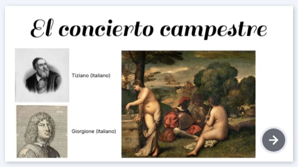 -Título de la obra: Concierto campestre-Año de realización: 1510 (siglo XVI) -Autor: Tiziano o Giorgione -Técnica: Óleo sobre tabla -Estilo: Renacimiento -Tamaño: 118 cm x 138 cm -Localización: Museo del Louvre, París, Francia