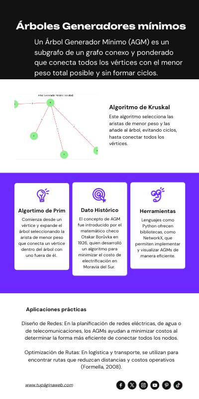 Un Árbol Generador Mínimo (AGM) es un subgrafo de un grafo conexo y ponderado que conecta todos los vértices con el menor peso total posible y sin formar ciclos.