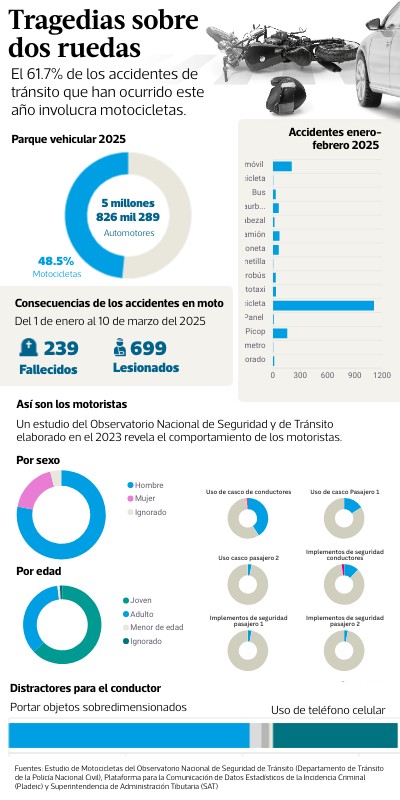 Fuentes: Estudio de Motocicletas del Observatorio Nacional de Seguridad de Tránsito (Departamento de Tránsito de la Policía Nacional Civil), Plataforma para la Comunicación de Datos Estadísticos de la Incidencia Criminal (Pladeic) y Superintendencia de Administración Tibutaria (SAT)