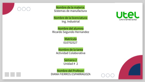 Nombre de la materia: Sistemas de manufactura Nombre de la licenciatura: Ing. Industrial Nombre del alumno Ricardo Segundo Hernandez Matrícula 010702527 Nombre de la tarea Actividad Colaborativa Semana 2 Unidad # 2 Nombre del Profesor DIANA FIERROS ESPARRAGOZA