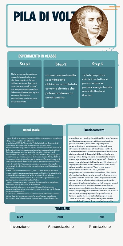 La pila di volta costituisce l’antenato della batteria elettrica moderna ed il primo generatore di elettricità.Inventata nel 1799 da Alessandro Volta fu il risultato di una serie di esperimenti in risposta alle precedenti misurazioni fatte dall’anatomista Luigi Galvani, il quale aveva scoperto che i muscoli di delle rane morte si contraevano se toccati da una coppia di elettrodi.Questo fenomeno incuriosì Volta che lo studiò e dedusse che il movimento dei muscoli delle rane era un indicatore del passaggio di corrente, una specie di strumento di misura naturale. Notò, infatti, che il movimento muscolare della rana veniva amplificato in presenza di elettrodi di materiali diversi e che questo fenomeno non si verificava con tutti i materiali. Capì, dunque, che a generare questo impulso erano gli elettrodi stessi messi in comunicazione, non il fluido ipotetico di Galvani.metalli scelti erano fondamentali, come sostenuto da Volta, ma la corrente elettrica era generata da reazioni chimiche fra gli elettrodi e la carne della rana. In seguito, Volta fu capace di riprodurre il fenomeno senza utilizzare corpi di animali e fu in grado di costruire quella che viene chiamata la pila di Volta.L'invenzione venne annunciata in una lettera rivolta al presidente della royal society di Londra, il 20 marzo 1800.Denominata inizialmente organo elettrico artificiale oppure apparato elettromotore, venne battezzata poi pila per via della sua struttura caratteristica. la pila valse a Volta fama e onori internazionali infatti il 7 novembre 1801 ne illustrò il funzionamento a Parigi di fronte a Napoleone Bonaparte che in tale occasione lo premiò con una medaglia d'oro.