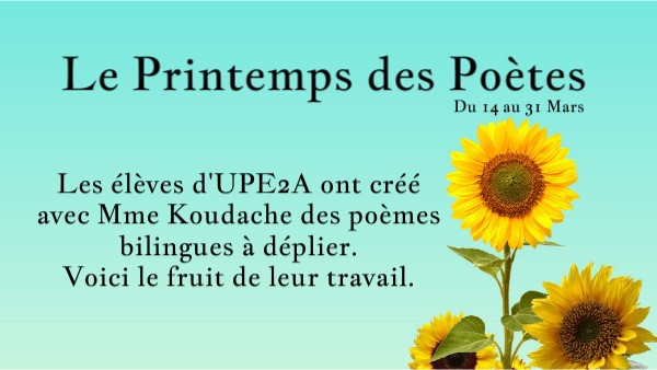 Les élèves d'UPE2A ont créé avec Mme Koudache des poèmes bilingues à déplier.Voici le fruit de leur travail.