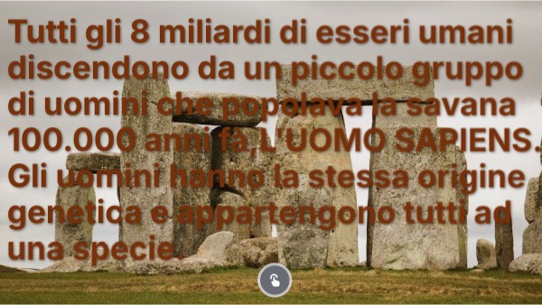 Tutti gli 8 miliardi di esseri umani discendono da un piccolo gruppo di uomini che popolava la savana 100.000 anni fà,L'UOMO SAPIENS. Gli uomini hanno la stessa origine genetica e appartengono tutti ad una specie.