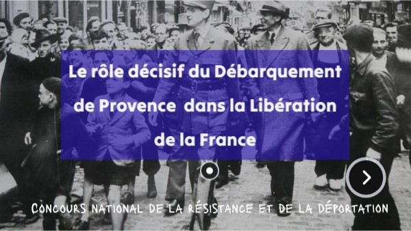 Les libérations de Toulon et de Marseille :Le jour J, les troupes terrestres françaises n’ont pas participé au débarquement. Mais dès le lendemain, l’armée B entre en action et va pouvoir débarquer pendant plusieurs jours. Alors que les forces Alliées remontent la vallée du Rhône, l’armée française doit s’occuper de libérer les villes portuaires de Toulon et Marseille. Même si l’armée allemande a reçu l’ordre de se replier vers le Nord, les divisions stationnées dans ces deux ports ont reçu l’ordre de les défendre jusqu’au bout. Le général de LATTRE de TASSIGNY décide de constituer deux groupes d’attaque.Les combats pour libérer Toulon ont lieu du 20 au 26 août. 15 000 soldats sont mobilisés, et le 20 août, une première compagnie de tirailleurs pénètre dans la cité. A l’intérieur, des Résistants se battent déjà contre les Allemands. Les troupes qui progressent sur l’est de Toulon doivent venir à bout de plusieurs poches de résistance. Au nord, le bataillon de choc, le 3e régiment de tirailleurs algériens et les FFI prennent position sur le Mont Faron. La ville est encerclée le 22 août. Les combats prennent fin le 26 et le 27, soldats et Résistants défilent dans la ville. Les combats pour libérer Marseille ont eu lieu entre le 21 et le 28 août. Dès le 19 août, les Résistants ont déclenché une insurrection armée dans la ville, tandis que les troupes françaises, notamment la 3e Division d'Infanterie Algérienne et les Tabors marocains, ont encerclé et attaqué les positions allemandes. Ils entrent dans Marseille le 23 août. Les combats intenses et meurtriers vont durer cinq jours jusqu’à ce que le 28, les Allemands se rendent. La ville est libérée à J+13, soit un mois avant les objectifs fixés.Même si les deux ports ont été rendus inutilisables par les bombardements alliés pendant quelques semaines, ils vont s’avérer capital une fois remis en état au niveau logistique. Les Alliés peuvent recevoir 18 000 tonnes de fret quotidiennement.