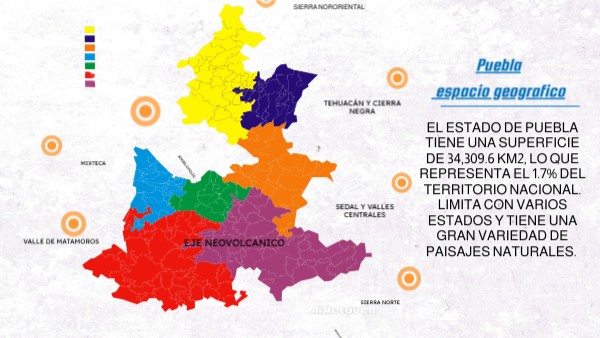 El estado de Puebla tiene una superficie de 34,309.6 km2, lo que representa el 1.7% del territorio nacional. Limita con varios estados y tiene una gran variedad de paisajes naturales.