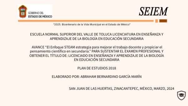 ESCUELA NORMAL SUPERIOR DEL VALLE DE TOLUCA LICENCIATURA EN ENSEÑANZA Y APRENDIZAJE DE LA BIOLOGÍA EN EDUCACIÓN SECUNDARIA AVANCE “El Enfoque STEAM estrategia para mejorar el trabajo docente y propiciar el pensamiento científico en secundaria.” PARA SUSTENTAR EL EXAMEN PROFESIONAL Y OBTENER EL TÍTULO DE: LICENCIADO EN ENSEÑANZA Y APRENDIZAJE DE LA BIOLOGÍA EN EDUCACIÓN SECUNDARIA PLAN DE ESTUDIOS 2018 ELABORADO POR: ABRAHAM BERNARDINO GARCÍA MARÍN