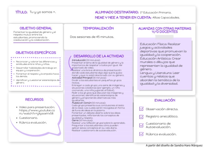 Introducción (10 minutos): Presentar el tema de la igualdad de género y la importancia de respetar a todos por igual. Ver viosionado de vídeo. Realizar una breve dinámica de presentación donde cada estudiante diga algo que le gusta hacer y que no esté relacionado con su género. Actividad Principal (30 minutos): Dividir a los estudiantes en pequeños grupos mixtos. Entregar a cada grupo una serie de imágenes y situaciones cotidianas (por ejemplo, un niño cocinando, una niña jugando al fútbol). Pedir a los grupos que discutan las imágenes y situaciones, identificando estereotipos de género y proponiendo alternativas más igualitarias. Puesta en Común (10 minutos): Cada grupo presenta sus conclusiones al resto de la clase. Las cuales serán recogidas en forma de lluvia de ideas en la pizarra. Fomentar un debate abierto sobre las ideas presentadas, reforzando los conceptos de igualdad y respeto. Cierre (10 minutos): Realizar una reflexión grupal sobre lo aprendido. Preguntar a los estudiantes cómo pueden aplicar estos conceptos en su vida diaria. Realizar cuestionario de autoevalaución.