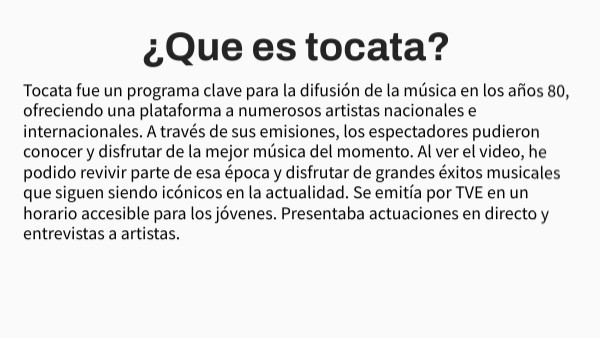 Tocata fue un programa clave para la difusión de la música en los años 80, ofreciendo una plataforma a numerosos artistas nacionales e internacionales. A través de sus emisiones, los espectadores pudieron conocer y disfrutar de la mejor música del momento. Al ver el video, he podido revivir parte de esa época y disfrutar de grandes éxitos musicales que siguen siendo icónicos en la actualidad. Se emitía por TVE en un horario accesible para los jóvenes. Presentaba actuaciones en directo y entrevistas a artistas.