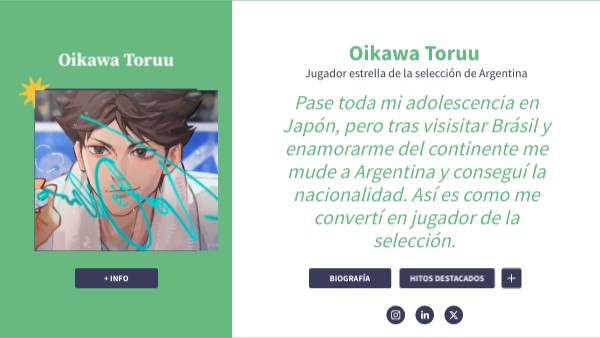 Cuando era más joven, y vivía en Japón, mis antiguos rivales me llamaban "El Gran Rey", esto era debido a un pequeño Junior de la escuela secundaria, el cuál le llamaban "El rey" para hacer enfásis a la tiranía que le envolvía. Era um gran colcocador y durante mucho tiempo me supuso un dolor de cabeza. Recuerdo bien aquellos años en los que me sobreesforzaba todas las tardes por mejorar, casi acabo consumido por el que pensarán los demás y por no llegar a ser lo sufucientemente bueno. Aún así doy gracias por haber tenido a mi lado a compañeros de equipo que supieron alegrarme y ewsforzarme. Además de darle especialemnte las gracias a Iwa-chan, (ahora mi prometido), que siempre me ayudo y me enderezo.