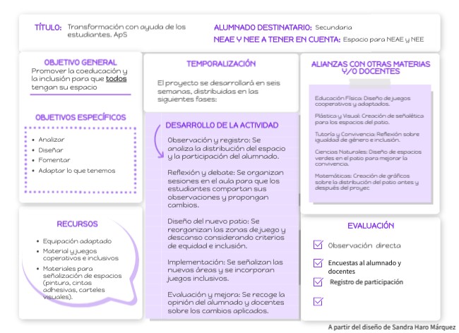 Educación Física: Diseño de juegos cooperativos y adaptados. Plástica y Visual: Creación de señalética para los espacios del patio. Tutoría y Convivencia: Reflexión sobre igualdad de género e inclusión. Ciencias Naturales: Diseño de espacios verdes en el patio para mejorar la convivencia. Matemáticas: Creación de gráficos sobre la distribución del patio antes y después del proyec