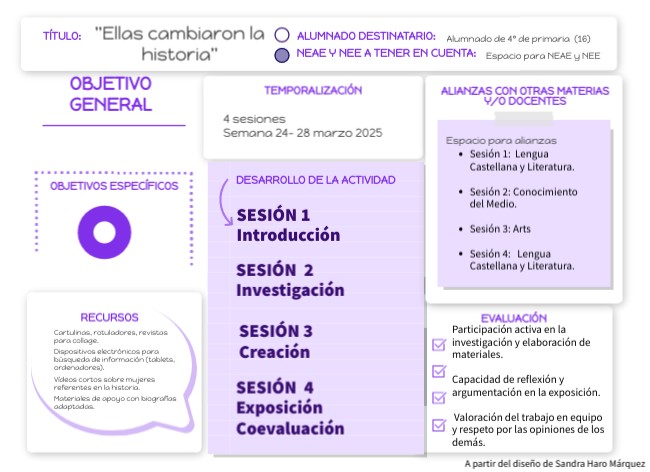 Sesión 3: Creación de pósteres y presentaciones.Objetivo: Elaborar materiales creativos que visibilicen el legado de las mujeres investigadas. Materiales: - Cartulinas, rotuladores, revistas para recortes, pegamento. - Digitales: ordenador y acceso a Canva o PowerPoint. esarrollo: 1. Cada equipo elige cómo presentar su investigación: póster, cómic, foto. 2. Diseño: los equipos organizan sus ideas y comienzan a crear sus materiales. 3. Se da tiempo para revisar los trabajos y hacer mejoras antes de la exposición, tras recibir retroalimentación de otro grupo.