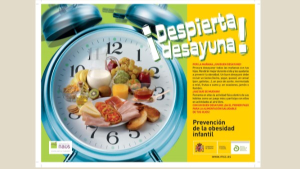 El documento es un cartel de prevención contra la obesidad infantil. El título es ¡ Despierta, desayuna!Se compone de una foto, un título/eslogán, un texto explicativo, los logotipos del gobierno de España y de la Agencia Española de Seguridad Alimentaria y NutriciónA la izquierda vemos una imagen que representa un despertador en el que hay los alimentos del desayuno como la leche, el jamón york, el jamón ibérico, el pan, las frutas, los cereales y el zumo de naranja.