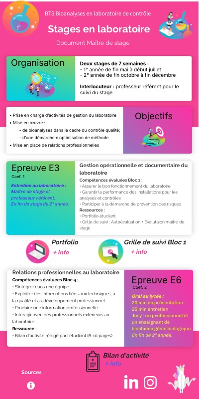 Compétences évaluées Bloc 4 : • S’intégrer dans une équipe • Exploiter des informations liées aux techniques, à la qualité et au développement professionnel • Produire une information professionnelle• Interagir avec des professionnels extérieurs au laboratoire Ressource : • Bilan d'activité rédigé par l'étudiant (6-10 pages)