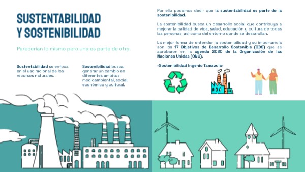 Por ello podemos decir que la sustentabilidad es parte de la sostenibilidad. La sostenibilidad busca un desarrollo social que contribuya a mejorar la calidad de vida, salud, educación y cultura de todas las personas, asi como del entorno donde se desarrollan. La mejor forma de entender la sostenibilidad y su importancia son los 17 Objetivos de Desarrollo Sostenible (ODS) que se aprobaron en la agenda 2030 de la Organización de las Naciones Unidas (ONU). -Sostenibilidad Ingenio Tamazula-