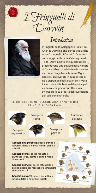 I fringuelli delle Galápagos studiati da Charles Darwin sono conosciuti anche come "fringuelli di Darwin". Durante il suo viaggio sulle Isole Galápagos nel 1835, Darwin notò che questi uccelli presentavano una straordinaria varietà di forme di becco, adattate alle diverse nicchie ecologiche delle isole. Ogni specie si era evoluta in base al tipo di cibo disponibile nell'area in cui viveva. La loro diversità fu una delle principali evidenze che portarono Darwin a sviluppare la sua teoria dell'evoluzione per selezione naturale.