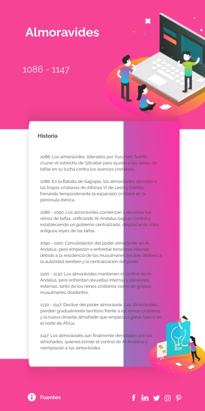 1086: Los almorávides, liderados por Yusuf ibn Tashfin, cruzan el estrecho de Gibraltar para ayudar a los reinos de taifas en su lucha contra los avances cristianos. 1086: En la Batalla de Sagrajas, los almorávides derrotan a las tropas cristianas de Alfonso VI de León y Castilla, frenando temporalmente la expansión cristiana en la península ibérica. 1086 - 1090: Los almorávides comienzan a absorber los reinos de taifas, unificando Al-Ándalus bajo su control y estableciendo un gobierno centralizado, desplazando a los antiguos reyes de las taifas. 1090 - 1100: Consolidación del poder almorávide en Al-Ándalus, pero empiezan a enfrentar tensiones internas debido a la resistencia de los musulmanes locales (árabes) a la autoridad beréber y la centralización del poder. 1100 - 1130: Los almorávides mantienen el control de Al-Ándalus, pero enfrentan revueltas internas y presiones externas, tanto de los reinos cristianos como de grupos musulmanes disidentes. 1130 - 1147: Declive del poder almorávide. Los almorávides pierden gradualmente territorio frente a los reinos cristianos y la nueva dinastía almohade que empieza a ganar fuerza en el norte de África. 1147: Los almorávides son finalmente derrotados por los almohades, quienes toman el control de Al-Ándalus y reemplazan a los almorávides.