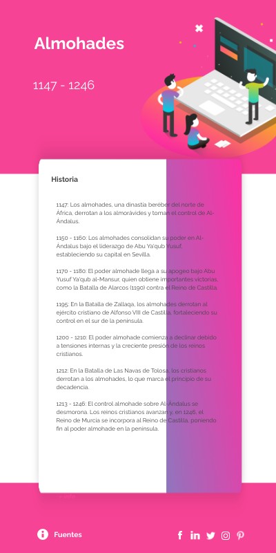 1147: Los almohades, una dinastía beréber del norte de África, derrotan a los almorávides y toman el control de Al-Ándalus. 1150 - 1160: Los almohades consolidan su poder en Al-Ándalus bajo el liderazgo de Abu Ya'qub Yusuf, estableciendo su capital en Sevilla. 1170 - 1180: El poder almohade llega a su apogeo bajo Abu Yusuf Ya'qub al-Mansur, quien obtiene importantes victorias, como la Batalla de Alarcos (1190) contra el Reino de Castilla. 1195: En la Batalla de Zallaqa, los almohades derrotan al ejército cristiano de Alfonso VIII de Castilla, fortaleciendo su control en el sur de la península. 1200 - 1210: El poder almohade comienza a declinar debido a tensiones internas y la creciente presión de los reinos cristianos. 1212: En la Batalla de Las Navas de Tolosa, los cristianos derrotan a los almohades, lo que marca el principio de su decadencia. 1213 - 1246: El control almohade sobre Al-Ándalus se desmorona. Los reinos cristianos avanzan y, en 1246, el Reino de Murcia se incorpora al Reino de Castilla, poniendo fin al poder almohade en la península.