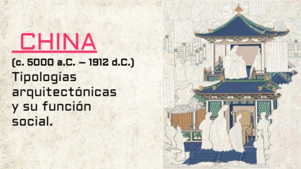 TIPOLOGÍAS ARQ: Palacios imperiales: Con una estructura centralizada y alineada según principios de Feng Shui, especialmente orientados al sur. Templos taoístas y confucianos: Espacios diseñados para la contemplación, educación y rituales, con énfasis en la armonía y simplicidad. Fortificaciones más avanzadas: Mayor uso de piedra y madera, mostrando un avance en técnicas de protección y defensa. Jardines rituales: Primeros intentos de integrar la naturaleza con el entorno construido para la meditación y la armonía espiritual.