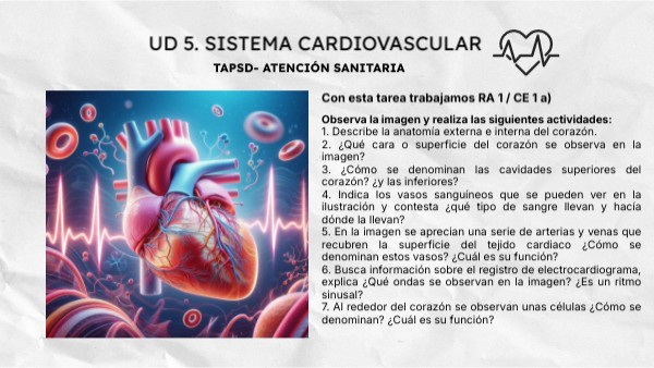 Observa la imagen y realiza las siguientes actividades: 1. Describe la anatomía externa e interna del corazón. 2. ¿Qué cara o superficie del corazón se observa en la imagen? 3. ¿Cómo se denominan las cavidades superiores del corazón? ¿y las inferiores? 4. Indica los vasos sanguíneos que se pueden ver en la ilustración y contesta ¿qué tipo de sangre llevan y hacía dónde la llevan? 5. En la imagen se aprecian una serie de arterias y venas que recubren la superficie del tejido cardiaco ¿Cómo se denominan estos vasos? ¿Cuál es su función? 6. Busca información sobre el registro de electrocardiograma, explica ¿Qué ondas se observan en la imagen? ¿Es un ritmo sinusal? 7. Al rededor del corazón se observan unas células ¿Cómo se denominan? ¿Cuál es su función?