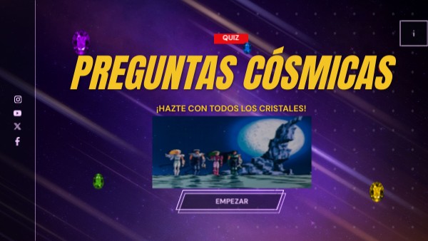 En un rincón lejano del universo, cinco Cristales Cósmicos han sido dispersados por diferentes galaxias. Estos cristales contienen un poder inmenso, capaz de mantener el equilibrio en el cosmos. Solo aquellas personas con el corazón valiente y un conocimiento profundo podrán recuperarlos. ¿Te ves capaz de asumir el desafío? Responde correctamente a las siguientes preguntas para reunir los cinco cristales y reclamar tu lugar entre los legendarios Héroes Cósmicos.