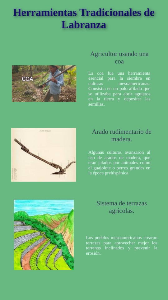 Algunas culturas avanzaron al uso de arados de madera, que eran jalados por animales como el guajolote o perros grandes en la época prehispánica.