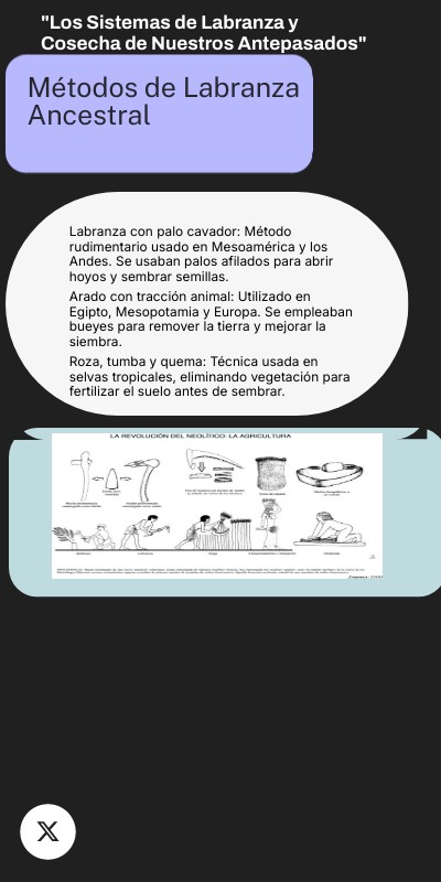 Labranza con palo cavador: Método rudimentario usado en Mesoamérica y los Andes. Se usaban palos afilados para abrir hoyos y sembrar semillas. Arado con tracción animal: Utilizado en Egipto, Mesopotamia y Europa. Se empleaban bueyes para remover la tierra y mejorar la siembra. Roza, tumba y quema: Técnica usada en selvas tropicales, eliminando vegetación para fertilizar el suelo antes de sembrar.