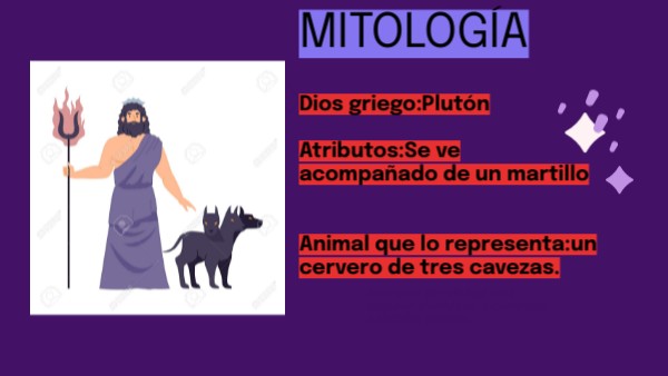 Dios griego:Plutón Atributos:Se ve acompañado de un martillo Animal que lo representa:un cervero de tres cavezas.