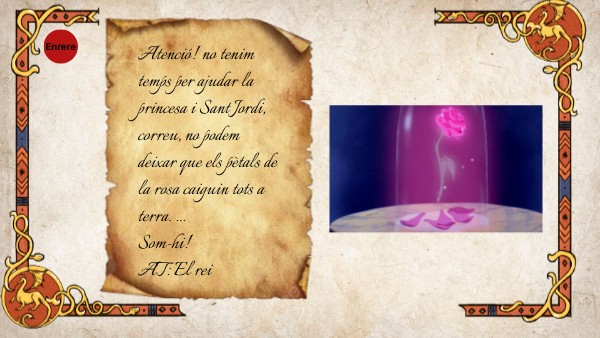 Atenció! no tenim temps per ajudar la princesa i Sant Jordi, correu, no podem deixar que els pètals de la rosa caiguin tots a terra. ... Som-hi! AT: El rei