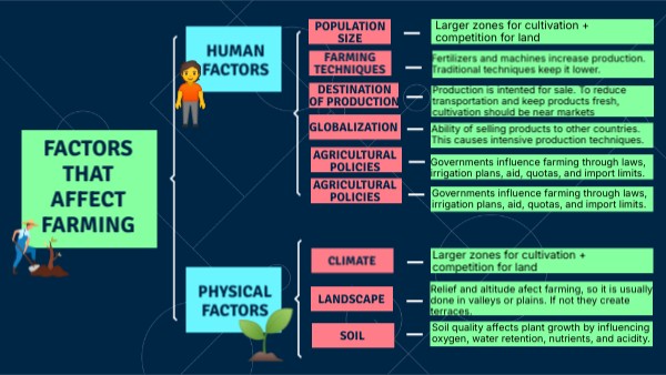 Relief and altitude afect farming, so it is usually done in valleys or plains. If not they create terraces.