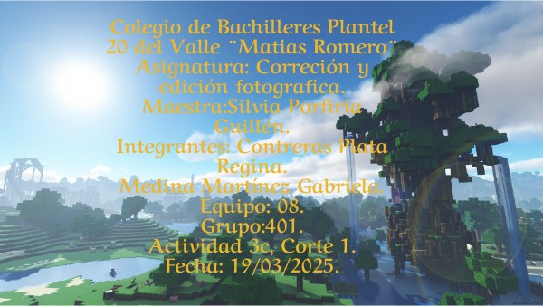 Colegio de Bachilleres Plantel 20 del Valle ¨Matias Romero¨Asignatura: Correción y edición fotografica. Maestra:Silvia Porfiria Guillén. Integrantes: Contreras Plata Regina. Medina Martínez Gabriela. Equipo: 08. Grupo:401. Actividad 3c, Corte 1. Fecha: 19/03/2025.