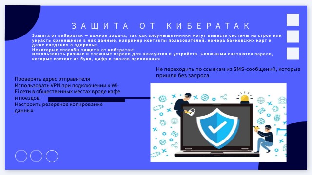 Защита от кибератак — важная задача, так как злоумышленники могут вывести системы из строя или украсть хранящиеся в них данные, например контакты пользователей, номера банковских карт и даже сведения о здоровье. Некоторые способы защиты от кибератак: Использовать разные и сложные пароли для аккаунтов и устройств. Сложными считаются пароли, которые состоят из букв, цифр и знаков препинания