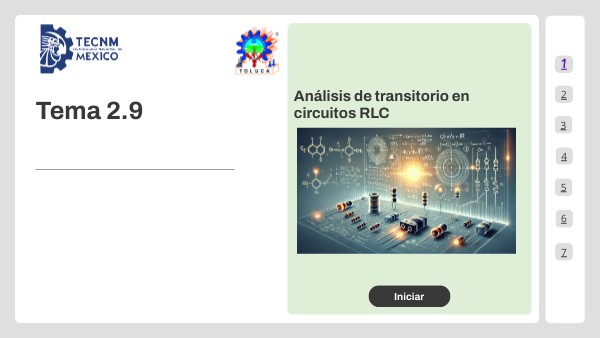 El análisis transitorio se enfoca en cómo las variables del circuito (como la corriente y el voltaje) evolucionan durante un cambio abrupto en el circuito, como cuando se conecta o desconecta una fuente de energía. Para estudiar este comportamiento, se considera que: •Al conectar un voltaje (o corriente) a un circuito RLC, el sistema no alcanza de inmediato su valor final, sino que pasa por un proceso de adaptación a la nueva condición, lo que se denomina "transitorio". Este comportamiento transitorio se describe mediante ecuaciones diferenciales que dependen de la resistencia, inductancia y capacitancia del circuito.