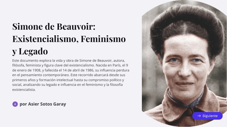 Este documento explora la vida y obra de Simone de Beauvoir, autora, filósofa, feminista y figura clave del existencialismo. Nacida en París, el 9 de enero de 1908, y fallecida el 14 de abril de 1986, su influencia perdura en el pensamiento contemporáneo. Este recorrido abarcará desde sus primeros años y formación intelectual hasta su compromiso político y social, analizando su legado e influencia en el feminismo y la filosofía existencialista.