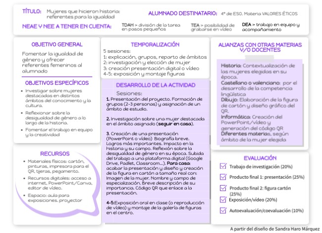 1. Presentación del proyecto. Formación de grupos (2-3 personas) y asignación de un ámbito de estudio.2. Investigación sobre una mujer destacada en el ámbito asignado (seguir en casa). 3. Creación de una presentación (PowerPoint o vídeo) Biografía breve. Logros más importantes. Impacto en la historia y su campo. Reflexión sobre la desigualdad de género en su época. Subida del trabajo a una plataforma digital (Google Drive, Padlet, Classroom…). Para casa: acabar la presentación y diseño y creación de la figura en cartón a tamaño real con: Imagen de la mujer. Nombre y campo de especialización. Breve descripción de su importancia. Código QR que enlace a la presentación. 4-5:Exposición oral en clase (o reproducción de vídeo) y montaje de la galería de figuras en el centro.