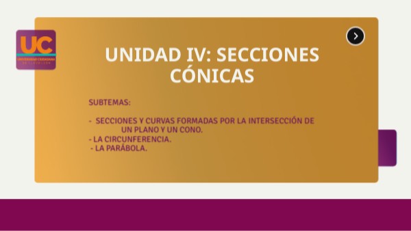 subtemas: - secciones y curvas formadas por la intersección de un plano y un cono. - la Circunferencia. - la Parábola.