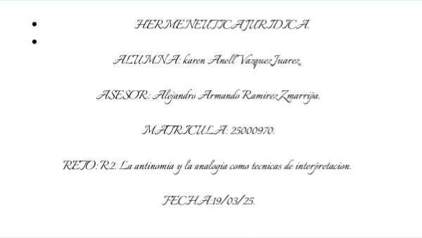 ALUMNA: karen Anell Vazquez Juarez. ASESOR: Alejandro Armando Ramirez Zmarripa. MATRICULA: 25000970. RETO: R2. La antinomia y la analogia como tecnicas de interpretacion. FECHA:19/03/25.