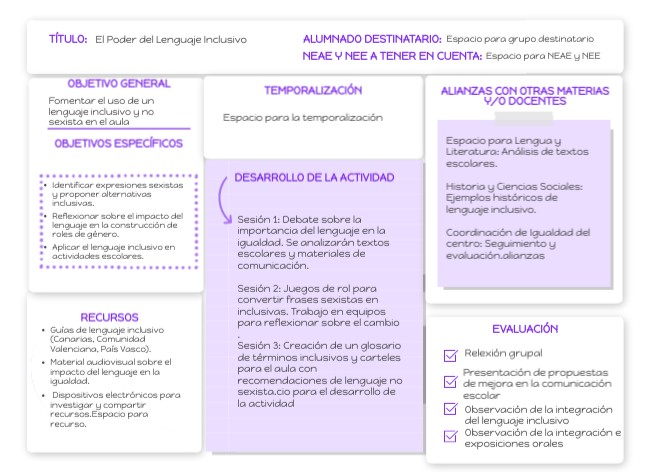Sesión 1: Debate sobre la importancia del lenguaje en la igualdad. Se analizarán textos escolares y materiales de comunicación. Sesión 2: Juegos de rol para convertir frases sexistas en inclusivas. Trabajo en equipos para reflexionar sobre el cambio . Sesión 3: Creación de un glosario de términos inclusivos y carteles para el aula con recomendaciones de lenguaje no sexista.cio para el desarrollo de la actividad