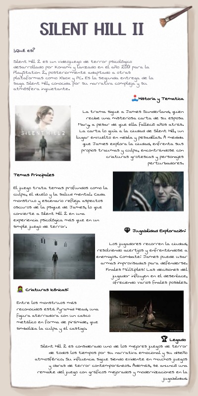 🕹Historia y Tematica La trama sigue a James Sunderland, quien recibe una misteriosa carta de su esposa Mary, a pesar de que ella falleció años atrás. La carta lo guía a la ciudad de Silent Hill, un lugar envuelto en niebla y pesadillas. A medida que James explora la ciudad, enfrenta sus propios traumas y culpa, encontrándose con criaturas grotescas y personajes perturbadores.