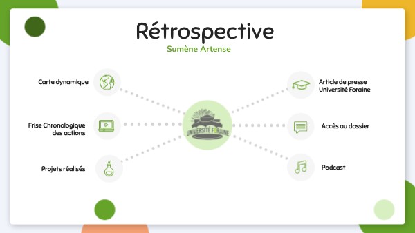 • Valorisation du patrimoine avec la réalité augmentée. • Création collective d’un jeu sur la mémoire.• Entreprendre sur le territoire : - 16 mars 2023 : Jury « 1 idée pour mon territoire » entreprendre en Sumène Artense - 3 Novembre 2022 : Présentation de l’Université Foraine à la soirée des entrepreneurs de Sumène Artense - 17 et 18 novembre 2022 : 24H pour entreprendre et innover du master ingénierie de la santé diagnostic biomédical - 27 avril 2023 : Participation à la journée « Territoire » à l’école universitaire de technologie – Université Grenoble Alpes• Wikipédia : - L’objectif est de promouvoir les communes à travers l’encyclopédie collective Wikipédia.