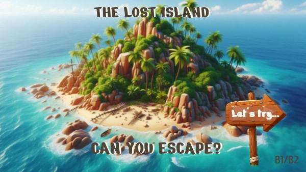 The boat trip was supposed to be fun and relaxing. The sun was shining, and the sea was calm. But suddenly, dark clouds covered the sky. The wind became strong, and huge waves crashed against the boat. The storm was too powerful. You tried to hold on, but the boat tipped over, and everything went dark…When you woke up, you were lying on a sandy beach. Pieces of the broken boat were everywhere. You looked around—there were no houses, no people, just trees and the sound of the ocean. You were on a desert island! You need to escape before nightfall. The only way is to build a raft and send a signal for rescue. But some raft pieces are missing! You must explore the island, find useful objects, and solve language challenges to collect everything you need.Time is running out. Can you and your team escape before it gets dark?