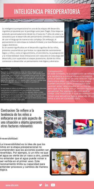 La inteligencia preoperacional es una de las etapas del desarrollo cognitivo propuestas por el psicólogo suizo Jean Piaget. Esta etapa se extiende aproximadamente desde los 2 hasta los 7 años de edad y se caracteriza por el desarrollo del pensamiento simbólico y la capacidad de usar el lenguaje de manera más compleja. Sin embargo, el pensamiento en esta etapa es todavía limitado y se manifiestan varios rasgos distintivosEs un avance significativo en el desarrollo cognitivo de los niños, presenta características que limitan su capacidad de razonamiento lógico y crítico, como el egocentrismo, el sincretismo, la yuxtaposición y la irreversibilidad. Estas limitaciones son naturales en esta etapa del desarrollo y son superadas en etapas posteriores, donde los niños comienzan a desarrollar un pensamiento más lógico y abstracto.