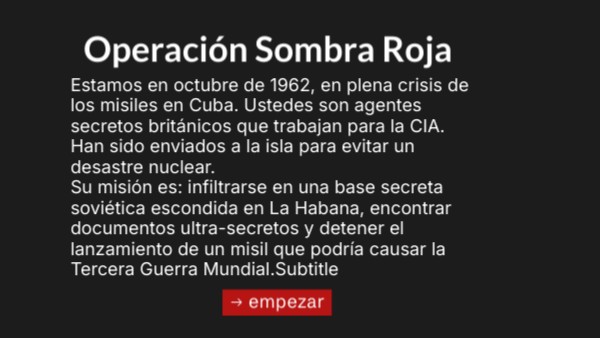 Estamos en octubre de 1962, en plena crisis de los misiles en Cuba. Ustedes son agentes secretos británicos que trabajan para la CIA. Han sido enviados a la isla para evitar un desastre nuclear. Su misión es: infiltrarse en una base secreta soviética escondida en La Habana, encontrar documentos ultra-secretos y detener el lanzamiento de un misil que podría causar la Tercera Guerra Mundial.Subtitle