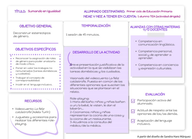 Breve presentación justificativa de la actividad en la que se visibilizan las tareas domésticas y los cuidados. Visionado del videocuento La feliz catástrofe. Puesta en común de las diferentes opiniones que susciten las situaciones que se plantean en el relato. Role-playing: 1-Hora del baño: niños y niñas bañan a un/a bebé, le visten, le dan el biberón… 2-Cocinamos: niños y niñas representan la cocina de una cosa y la cocina de un restaurante. 3-Acudimos a la consulta del médico/de la médica.