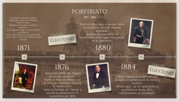 1876: Díaz derrocó al presidente Sebastián Lerdo de Tejada con el Plan de Tuxtepec, en el que se oponía a la reelección presidencial. 1877: Porfirio Díaz asumió la presidencia por primera vez. Durante su primer mandato, promovió la estabilidad política y el crecimiento económico, aunque con mano dura.